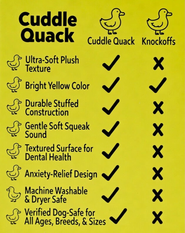 The Cuddle Quack is a cheerful yellow duck plush toy designed specifically as a comfort companion for dogs. It helps transform anxious moments into joyful playtime by encouraging cuddling, light chewing, and interactive play. Its ultra-soft texture releases calming endorphins to soothe anxiety, while the playful shape and squeaking sound promote excitement and distraction from stress. Additionally, it supports dental health by helping remove plaque and tartar through its textured surface.